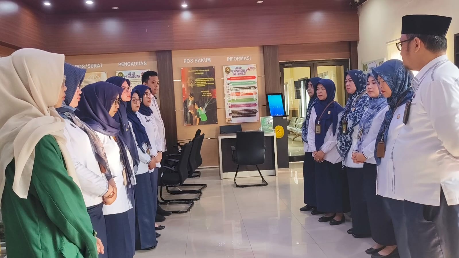 Manager on Duty, Panitera Muda dan Ketua Pengadilan Agama Tanjungkarang melaksanakan briefing Petugas PTSP yang dilaksanakan di ruang pelayanan setelah dilaksanakannya apel pagi.Β