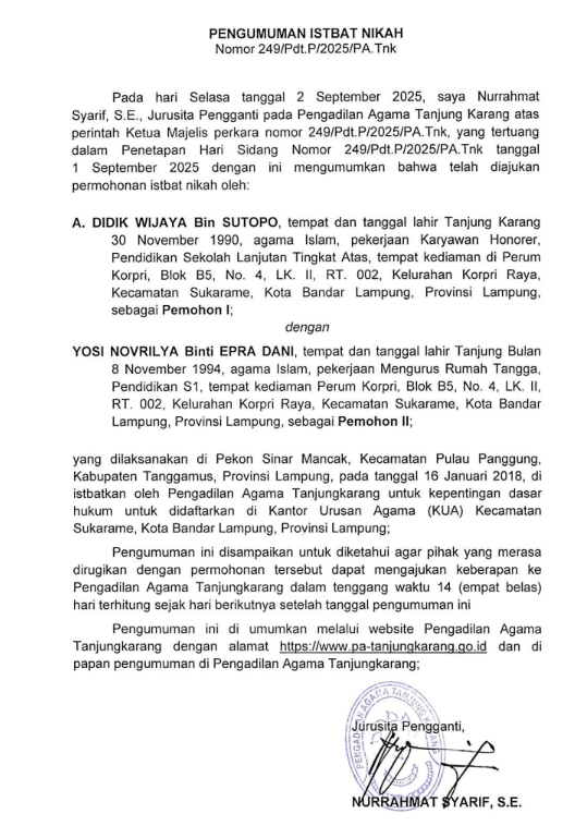 PENGUMUMAN ISBATH NIKAH PERKARA NO 249/Pdt.P/2025/PA.Tnk Ditulis oleh Mutia on 17 September 2025. Ditulis oleh Mutia on 17 September 2025. Dilihat: 69 ย PENGUMUMAN ISBATH NIKAH PERKARA NO 249/Pdt.P/2025/PA.Tnk ย ย