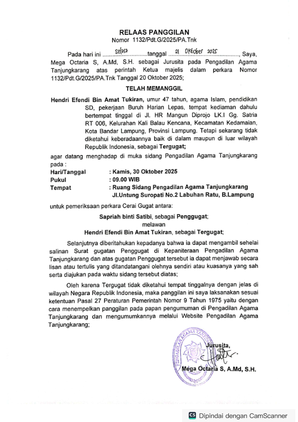 RELAAS PANGGILAN PERKARA NO.1132/Pdt.G/2025/PA.Tnk Ditulis oleh Mutia on 21 Oktober 2025. Ditulis oleh Mutia on 21 Oktober 2025. Dilihat: 31 RELAAS PANGGILAN PERKARA NO.1132 ย