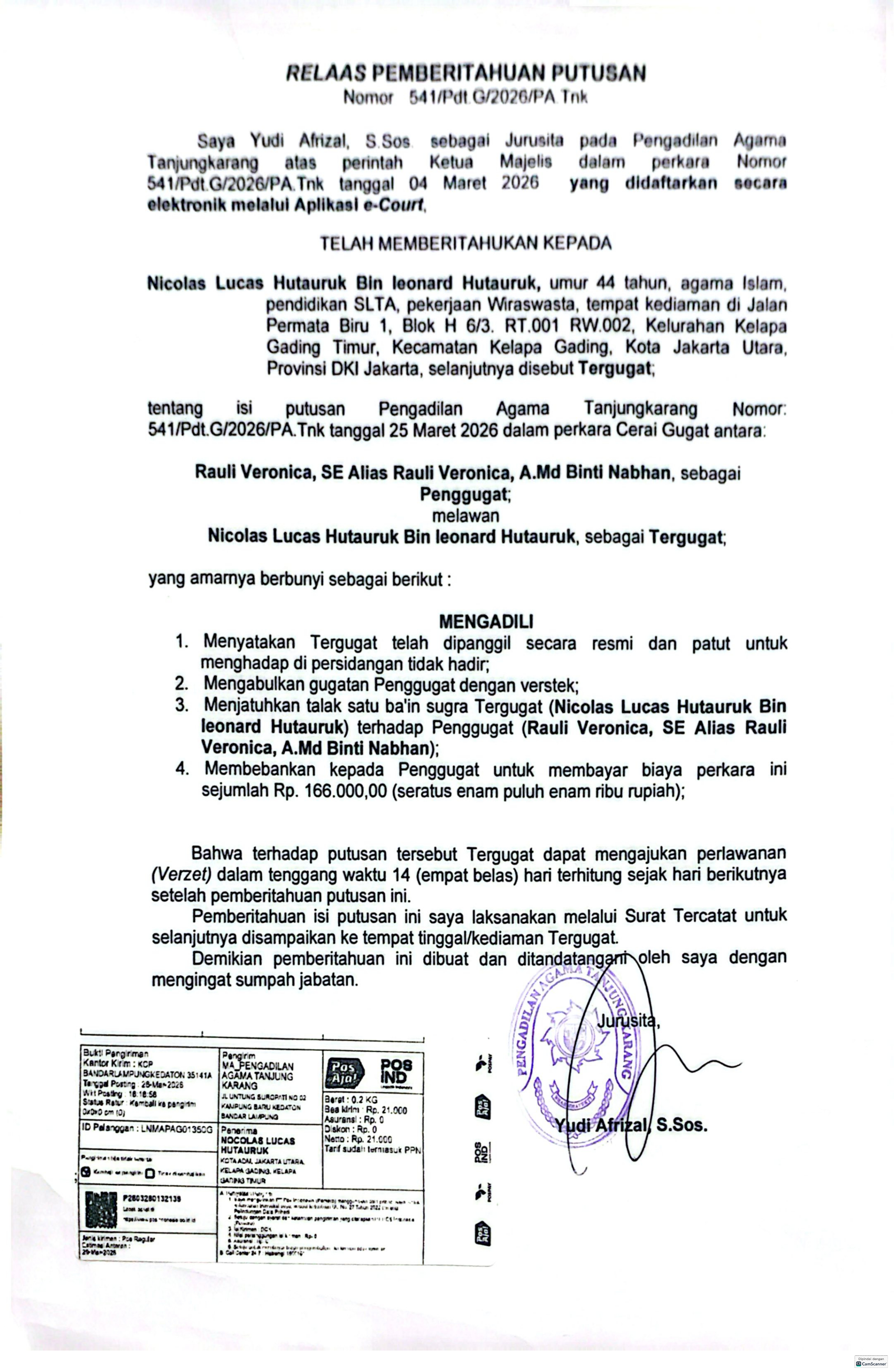Pengumuman Relaas Pemberitahuan Putusan perkara nomor 541/Pdt.G/2026/PA.Tnk Ditulis oleh Redaksi on 08 April 2026. Ditulis oleh Redaksi on 08 April 2026. Dilihat: 23